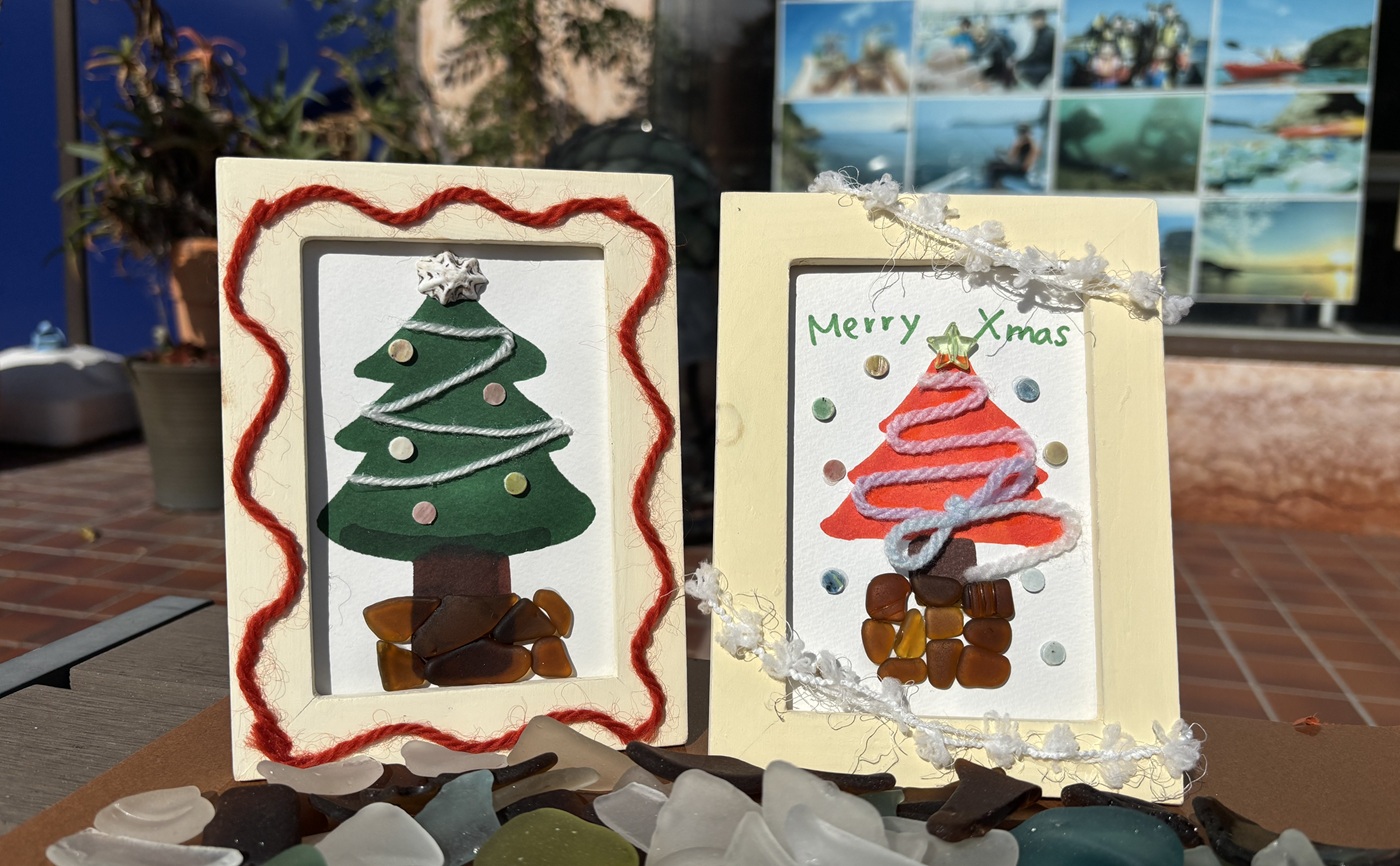 シーグラスや貝殻などの海の素材、マイクロプラスチックを再利用したパーツを選んで、フォトフレームを使ったクリスマスアートを作ります。
